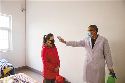 3月2日下午,在漯河市救助站二樓女區(qū),吃過(guò)午飯,余旺梅像往常一樣在房間內(nèi)休息,看手機(jī)上關(guān)于疫情進(jìn)展情況,然后測(cè)量體溫。余旺梅是一名月嫂,有時(shí)候,她還會(huì)看看書(shū),或者練習(xí)一下按摩手法,為以后找工作做準(zhǔn)備。