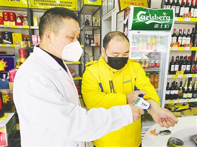 王黎明給商鋪店員測量體溫。